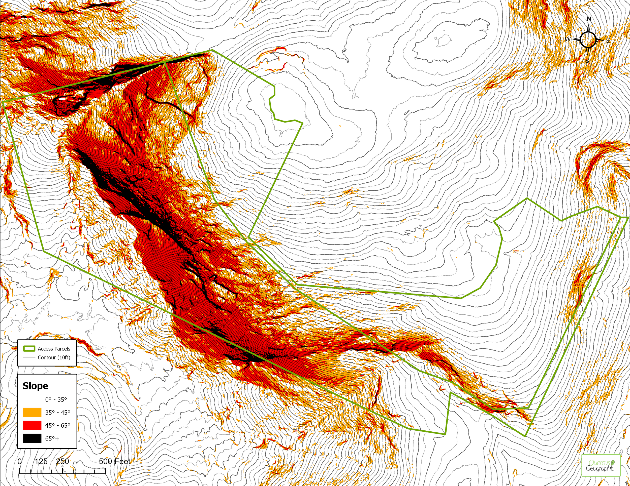 In-depth slope analysis with custom delineating, visualizations, and symbology that can be exported as packaged layers or georeferenced, import-ready maps.